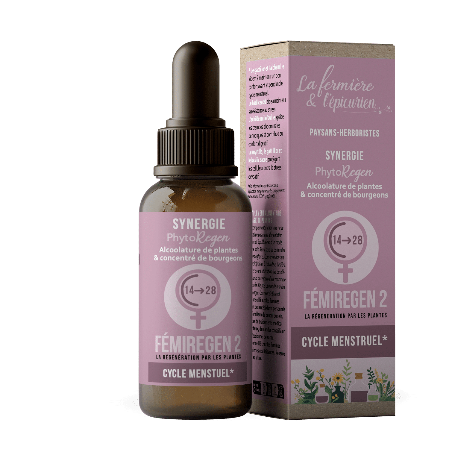 La période qui précède les règles est souvent synonyme de tempête hormonale (humeur, gonflement, tensions). Femiregen 2 est spécifiquement formulé pour cette phase (du 14ème au 28ème jour). Nous avons choisi le gattilier, l’alchémille, le bourgeon de pommier, plantes « progestérone-like » traditionnelles, pour contrebalancer les déséquilibres et apaiser l’irritabilité et les tensions mammaires ou abdominales.