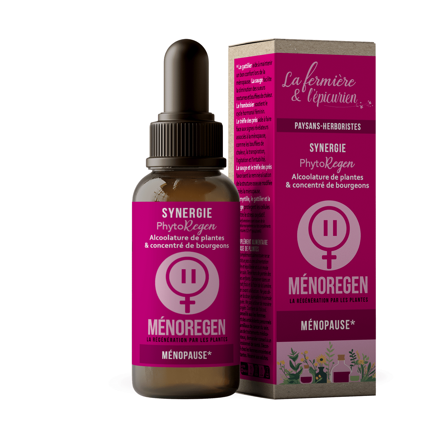 Ce mélange associe les alcoolatures de gattilier, sauge officinale, framboisier et trèfle aux macérats de bourgeons de pommier et de framboisier. Il a été concocté pour accompagner les femmes durant la ménopause et apaiser les bouffées de chaleur.