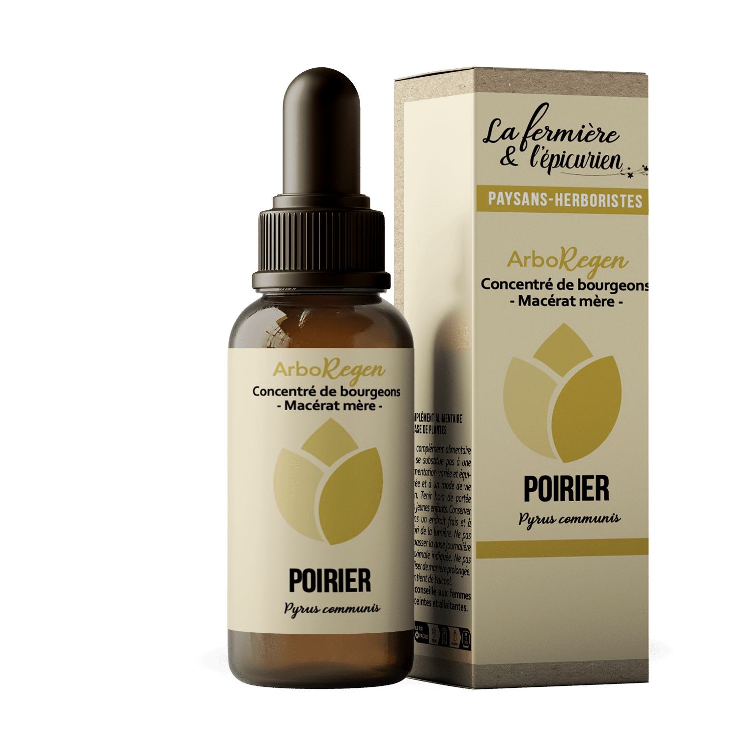 Le Poirier (Pyrus communis L.) est un arbre fruitier au bois dur et noble, symbole de bon gouvernement et de clairvoyance dans les traditions anciennes. En gemmothérapie, bien qu’il soit moins connu que le Figuier ou le Cassis, il est apprécié par les initiés pour son action subtile. C’est une plante qui « structure » dans le calme, souvent utilisée en fond pour accompagner d’autres bourgeons.